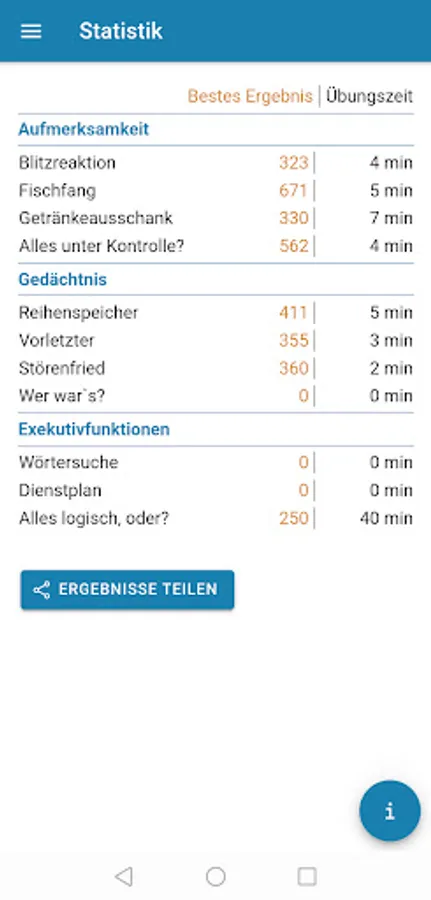 After each practice round you will immediately receive an evaluation with the current result and the previous result history. In addition, your records are collected in a statistic that you can share with friends.