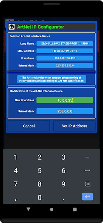 The Art-Net IP Configurator allows you to set the IP address and subnet mask of any Art-Net devices (*).