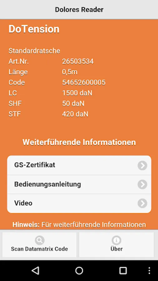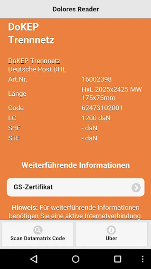 With the free Reader from Dolores Dolezych GmbH & Co. KG and the Steinbeis Research Centre Institute for Transportation and Logistics (ITL) Bremerhaven, you can scan the Data Matrix codes on the products of Dolezych. In addition to the detailed data you receive the following additional information about the product: