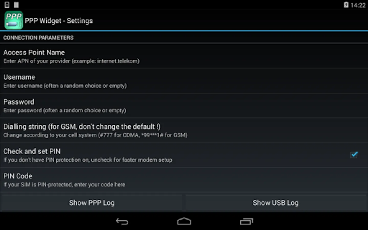 !! Attention !! Newer Google devices with stock Android > 4.2 have kernel module loading disabled. PPP Widget will most likely not work on these; use PPP Widget 2 which does not need kernel drivers.
