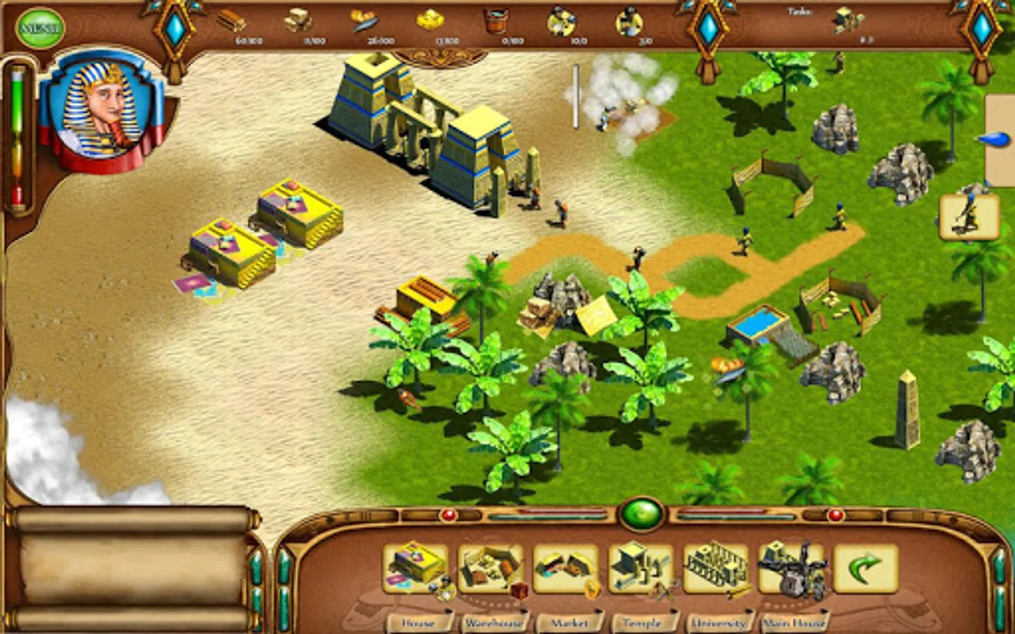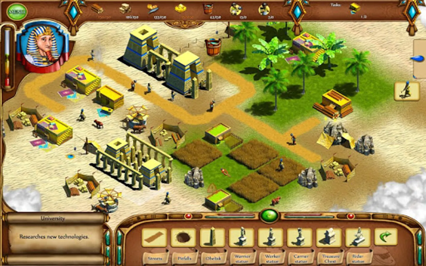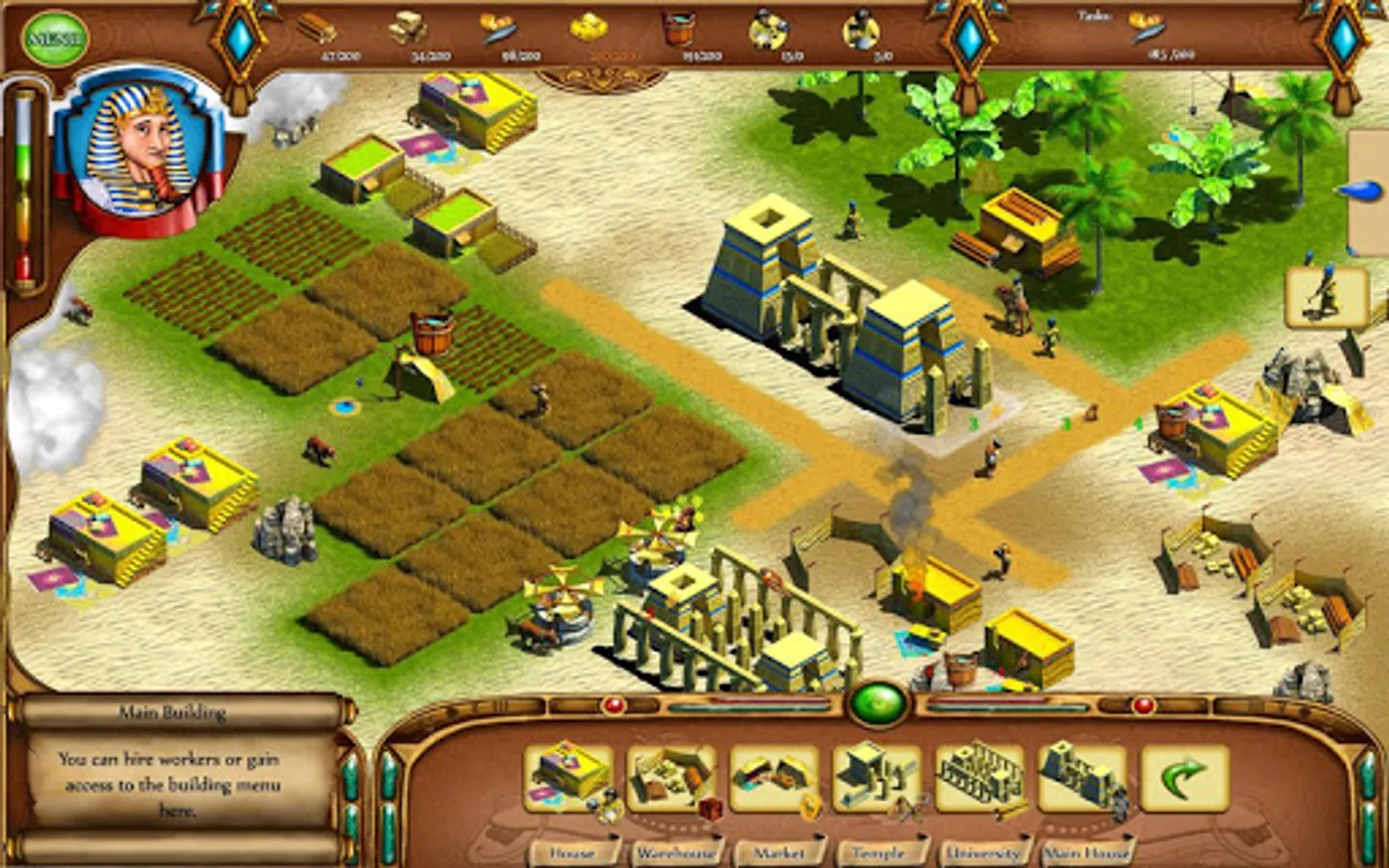Trade resources at your market, search for treasuries, build bridges to gain access to remote places and provide your population with food as well as in good mood. By establishing a well-developed economy, your main goal is to provide resources to the Pharaohs warehouses, so the threat of a famine can be prevented!
