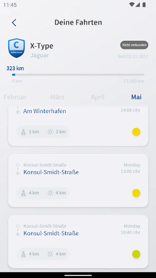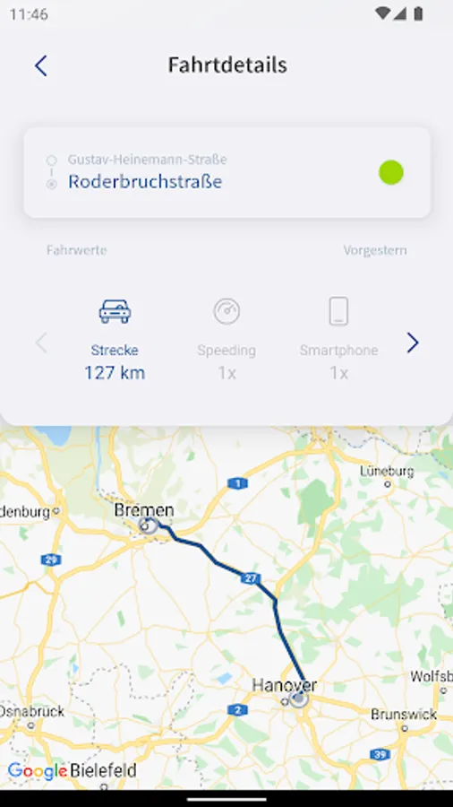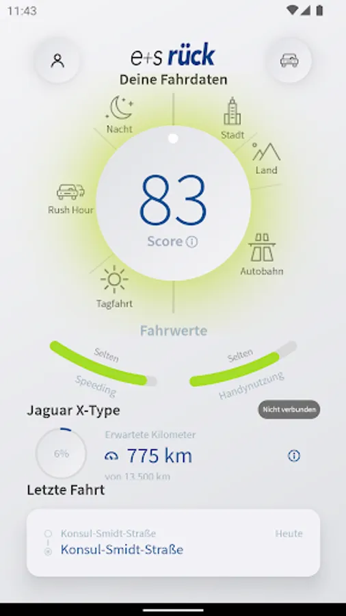 Telematics app from E + S Rückversicherung AG - for interested customers. The app connects to the associated Bluetooth beacon in the vehicle and automatically records the driving data. All relevant driving data are displayed in the app. Tariff characteristics are calculated and the annual savings for the policyholder are shown. All interested parties can contact E + S reinsurance directly for a test of the MVP.