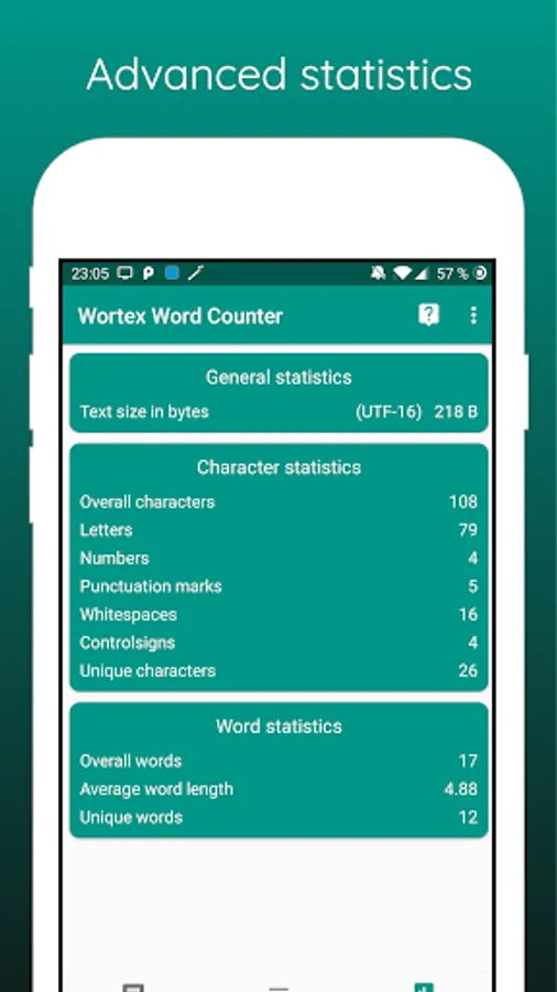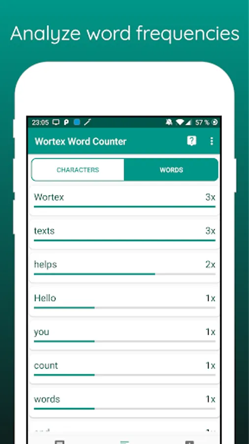 Just insert a text and wortex analyzes the contained words and signs and shows you the amount and frequency.