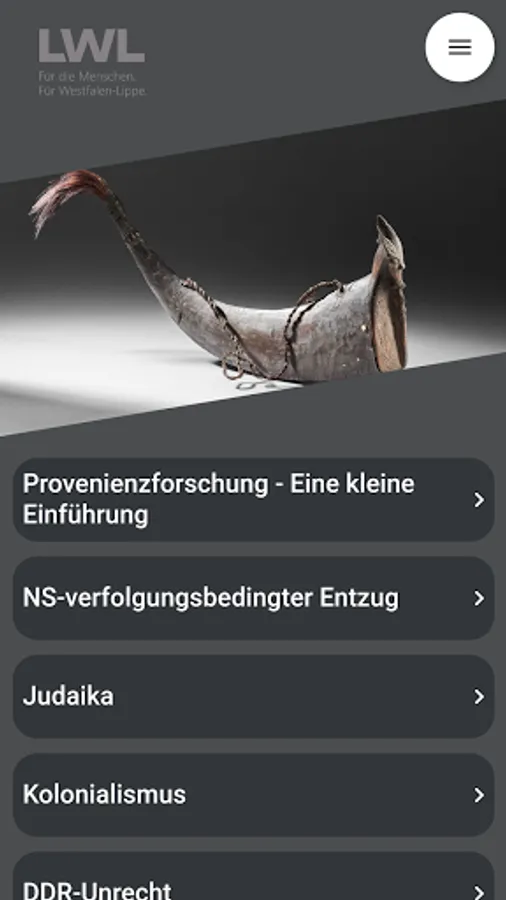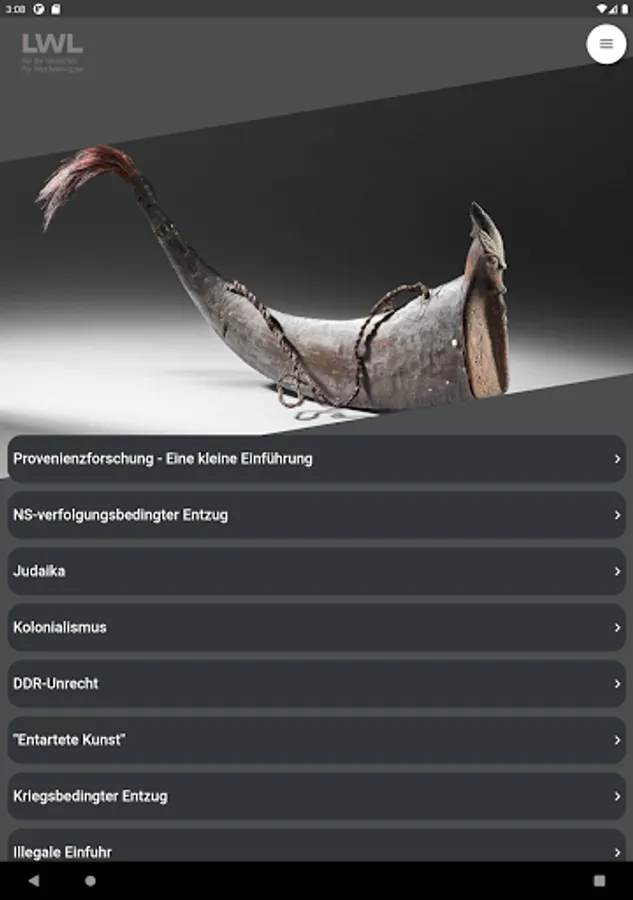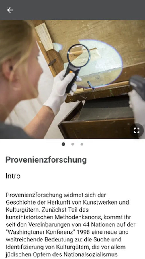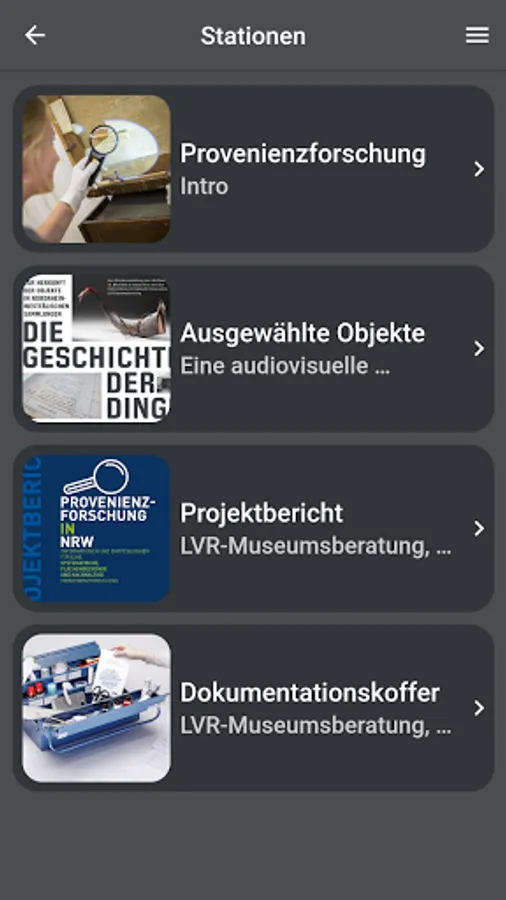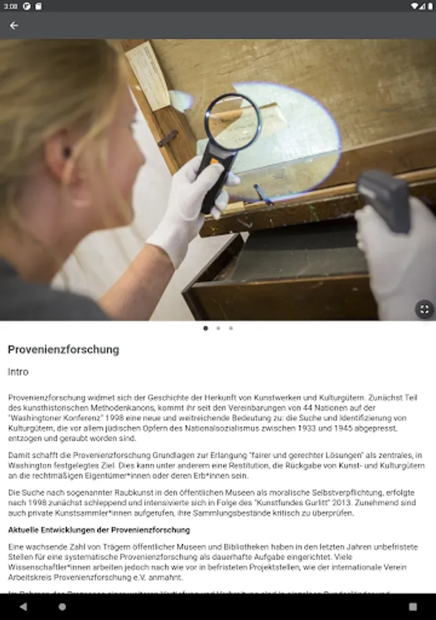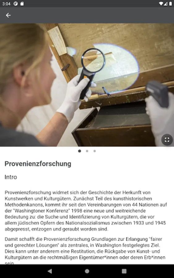The app allows you to visit the exhibition from home; all ten chapters are presented with extensive accompanying material. (Almost) all objects in the exhibition are shown and - only here - explained in more detail with numerous other documents, audio clips and films. Each chapter also contains a small presentation in which one of the curators personally presents individual objects again. Thanks to the numerous additional information (brochures, websites, etc.), the app offers a first comprehensive insight into provenance research, into the work of relevant institutions, but also into general contexts.