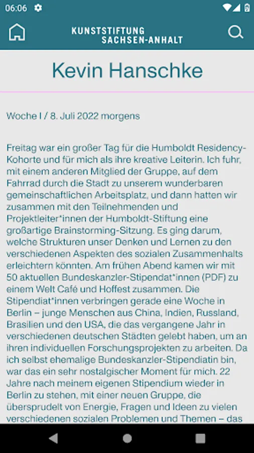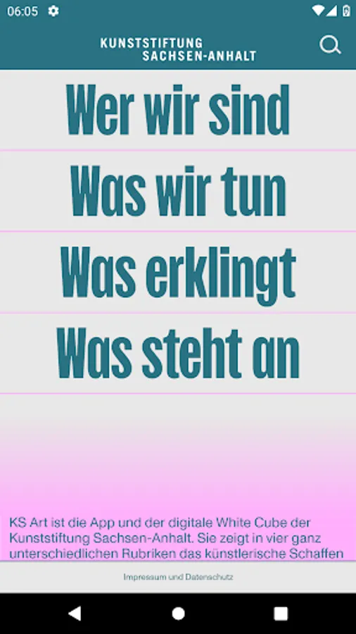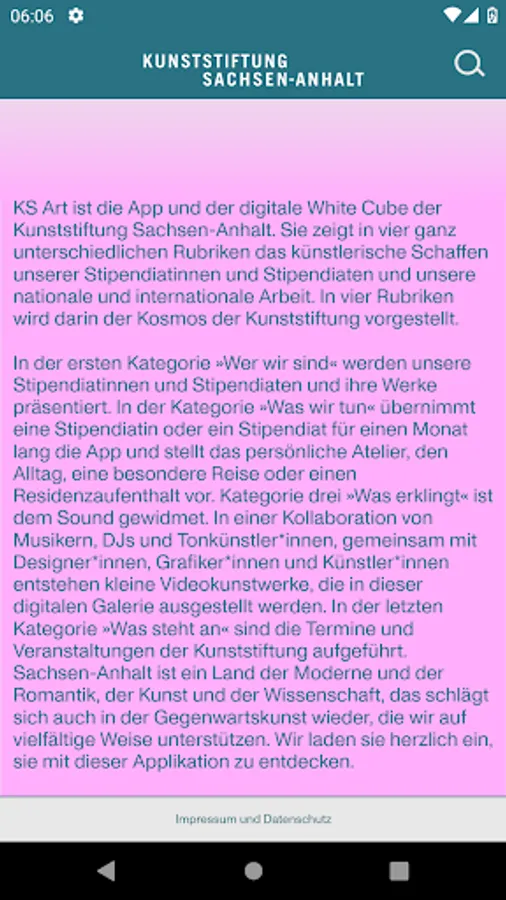KS Art is the app and the digital white cube of the Saxony-Anhalt Art Foundation. It shows the artistic work of our scholarship holders and our national and international work in four very different categories. The cosmos of the art foundation based in Halle an der Saale is presented in four sections. In the first category "Who we are" our scholarship holders and their works are presented. In the “What we do” category, a scholarship holder takes over the app for a month and presents their personal studio, everyday life, a special trip or a residency. Category three "What sounds" is dedicated to sound. In a collaboration of musicians, DJs and sound artists, together with designers, graphic designers and artists, small video works of art are created that are exhibited in this digital gallery. The dates and events of the Art Foundation are listed in the last category "What's coming up". Saxony-Anhalt is a state of modernity and romanticism, of art and science, which is also reflected in contemporary art, which we support in a variety of ways. We cordially invite you to discover them with this application.