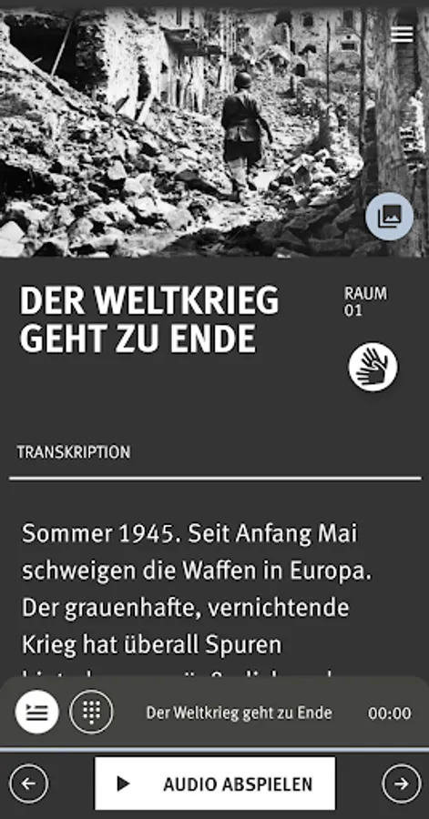 Experience the exhibition with the multimedia guide and let yourself be guided through the exhibition with exciting audio and video content. Additional images, interviews with contemporary witnesses, original documents and augmented reality call attention to the world of 1945.