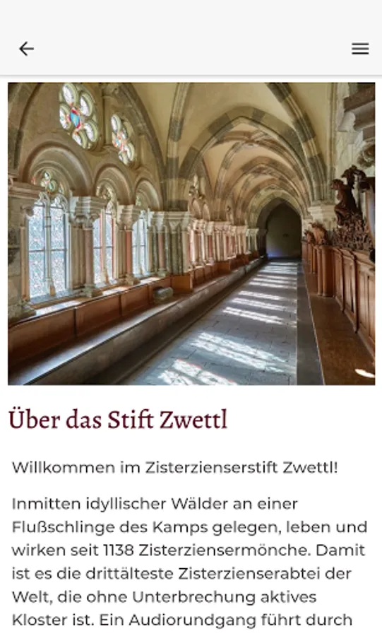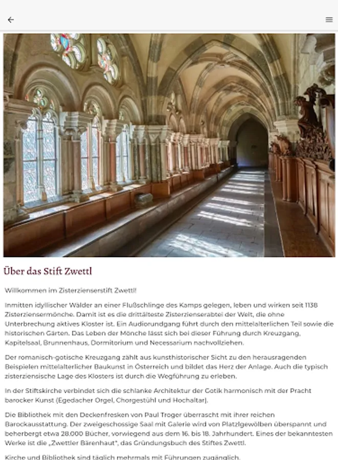 This app offers interesting facts about the Cistercian monastery Zwettl, founded in 1138, using an interactive map and a guided audio tour. Visitors discover both, the interior and the exterior, and enjoy the unique atmosphere of the location. Life in a medieval monastery can be discovered during a tour of the cloister with fountain house, chapter house, dormitory and necessarium. The typical Cistercian location at the river can be experienced, too.