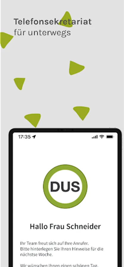 The DUSOFFICE is the friendly voice for your company. Offer your callers constant availability by phone if you cannot answer the phone yourself. It doesn't matter whether it's a meeting, appointments away from home or a well-deserved annual vacation - our agents routinely take all calls on behalf of your company. Your personal team notes all relevant data and informs you in real time via push notification.