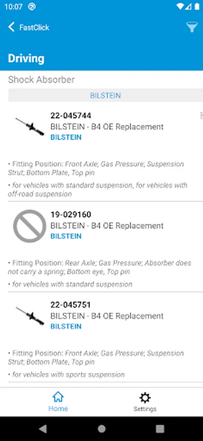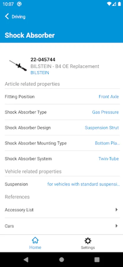 The app takes you directly to the article you want. Just select a vehicle manufacturer, model series, vehicle type and component, and you will immediately be shown the corresponding results from the BILSTEIN range.