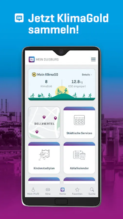 KLIMAGO: Leave your car at home and collect KlimaGold coins for every kilometer you walk, cycle or use public transport. Activate your profile in the MEIN DUISBURG app. You can redeem your KlimaGold points at selected partners.