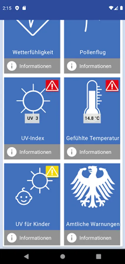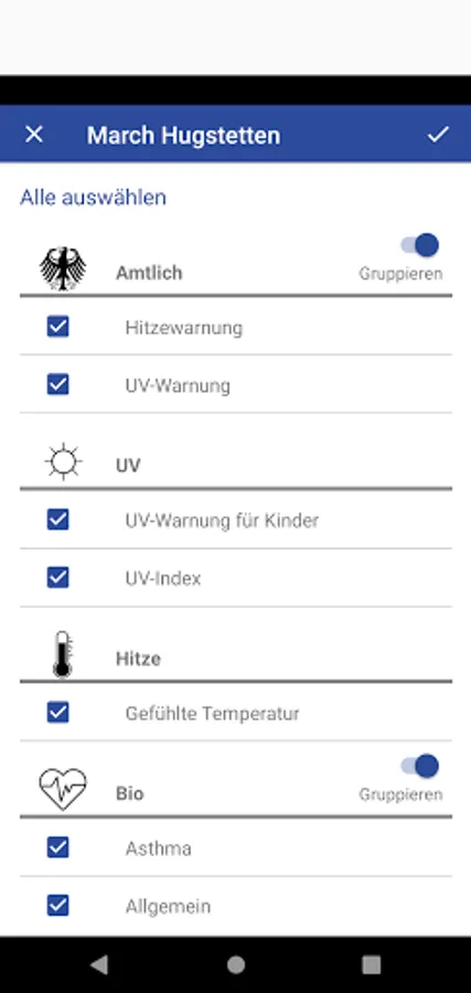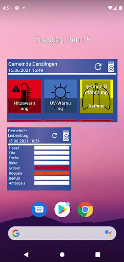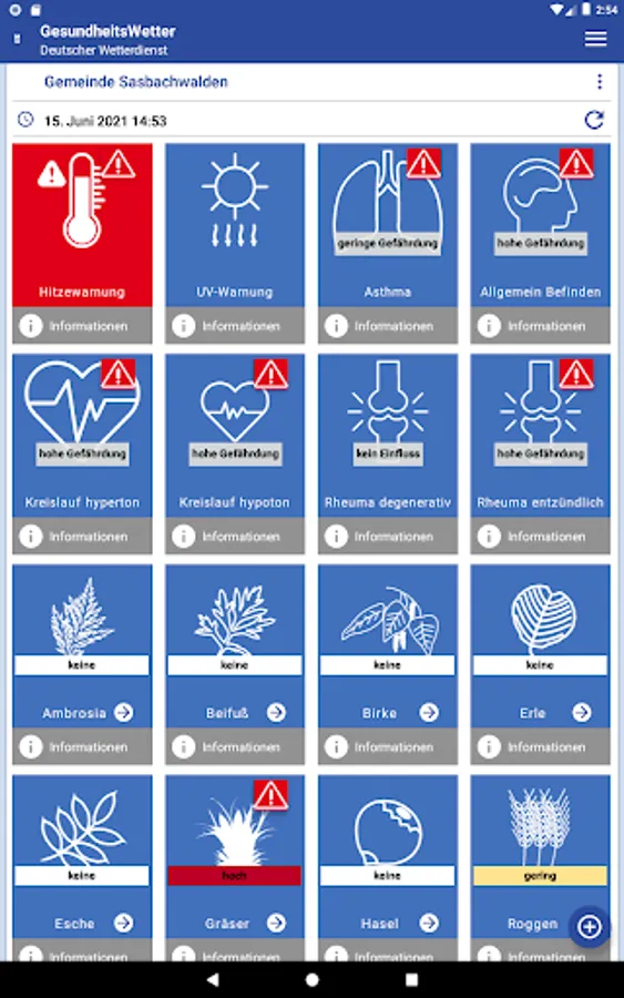 • Overview of the health weather (hazard information and official warnings) for freely selectable locations in Germany: