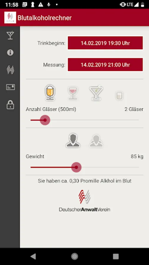 Would you like to know how alcohol consumption affects the blood alcohol level? The blood alcohol calculator of the German Bar Association will help you.