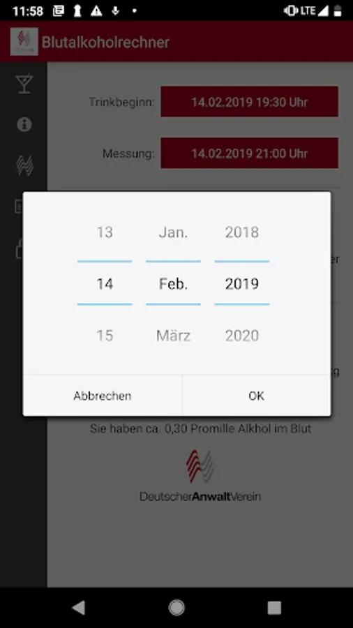 The official blood alcohol calculator of the German Bar Association will help you quickly and easily. With only a few inputs, the blood alcohol concentration can be determined. The app distinguishes between the sexes, different weight and different types of alcohol. In addition, the app determines the BAC (blood alcohol concentration) in relation to the start of drinking and the time of measurement.