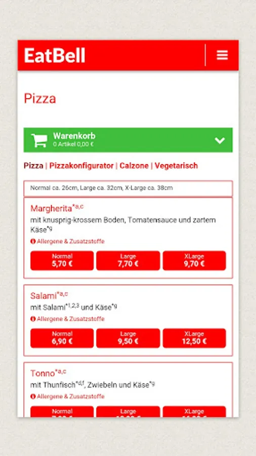 In the shop you can easily look at rest and make your individual choice. What do you want to eat? Decide on one of our delicious creations. If it is not the right things, do you imagine your own creation according to your wishes with the Pizza Configurator together.