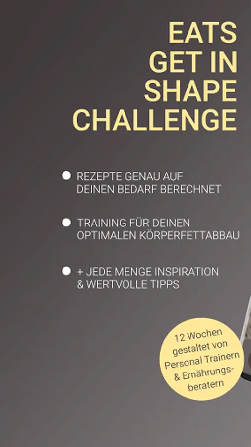 Your EATS Challenge ends automatically after 12 weeks. It is not a subscription, which is why it is not possible to offer a trial period in accordance with the Playstore's specifications. However, you can download the app for free. Discover and calculate your individual need for calories and all macronutrients and get a first impression. You can only activate it for a fee if you decide to actually implement your challenge with individually calculated meals and a tailored training plan.