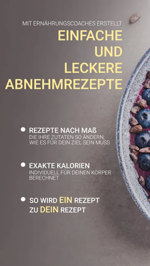 What makes our solution special: Real individuality. Here, ONE recipe becomes YOUR recipe. This means that all recipes with the app are calculated individually for you and your body, both for calories and for protein, carbohydrates and fats. So every recipe is really YOUR recipe. Your training plan for optimal body fat loss is just as needs-based. It is based on what you tell us about yourself, your everyday life and your goal.