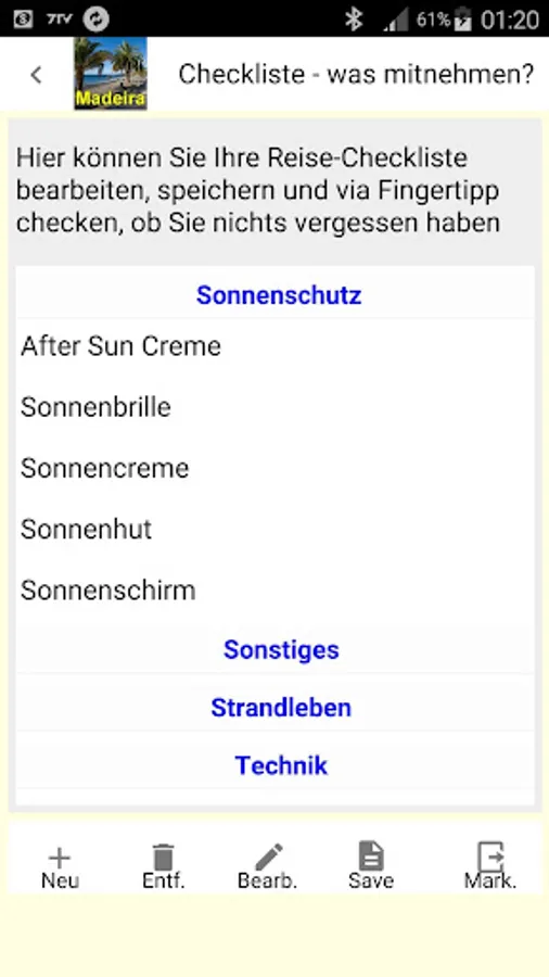 In addition to climate tables with average day, night and water temperatures as well as sunshine hours and rainy days, this app also contains travel checklists for your first-aid kit and your holiday luggage, which you can refine yourself and use again on your next vacation. You put a tick behind the things that you have already packed with a tap of your finger. Before the next vacation, you can remove all hooks with one click. In addition, we also have a look at the history and our short beach overview, as well as our excursion tips for those in a hurry. You can also keep a travel diary within the app and there is also a currency converter.