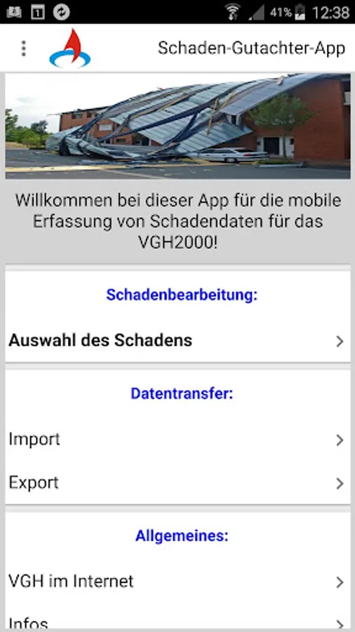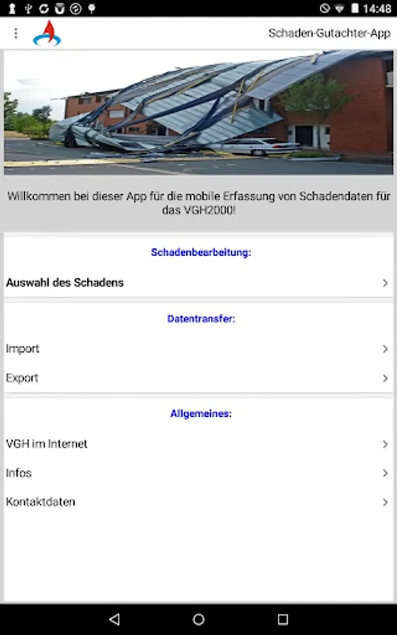 The loss appraiser app is used for the mobile recording of loss data on tablets and smartphones for the VGH2000 Windows program. Therefore, access is only possible with a password. This app can also be used for other claims processing programs by adapting the import / export interface accordingly.
