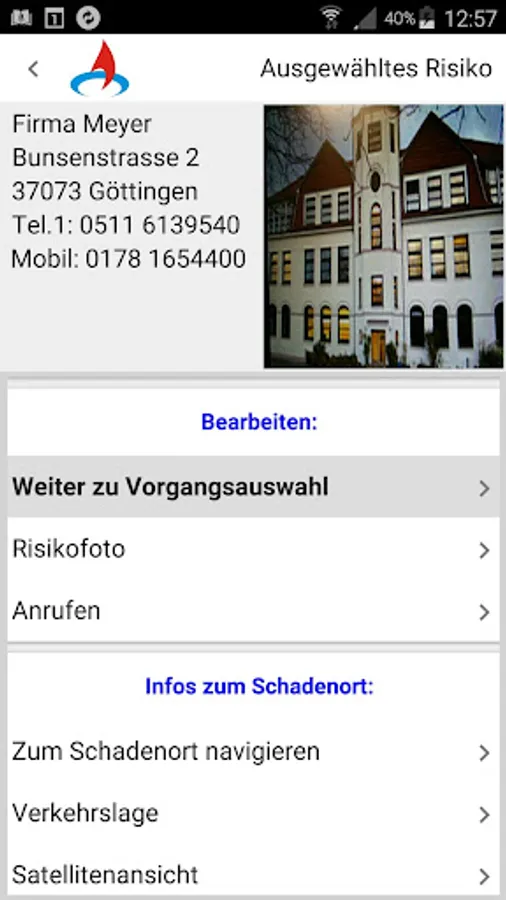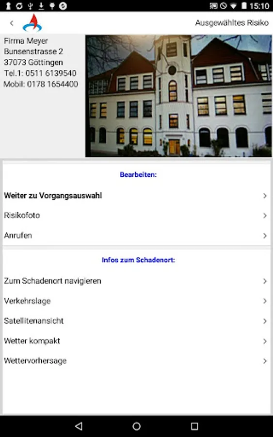 In addition, the app allows you to navigate directly to the damage location at the touch of a finger! For your planning of the visits, you can also have the satellite view of the respective damage location shown directly, as well as the information relevant to outdoor visits regarding rain or snow in winter: It is also often important to have a look at the traffic situation at the damage location that you are in App can do with one tap. If you should still be stuck in a traffic jam, the app also gives you the option of calling the damage location at the push of a button.