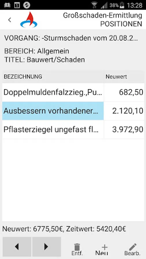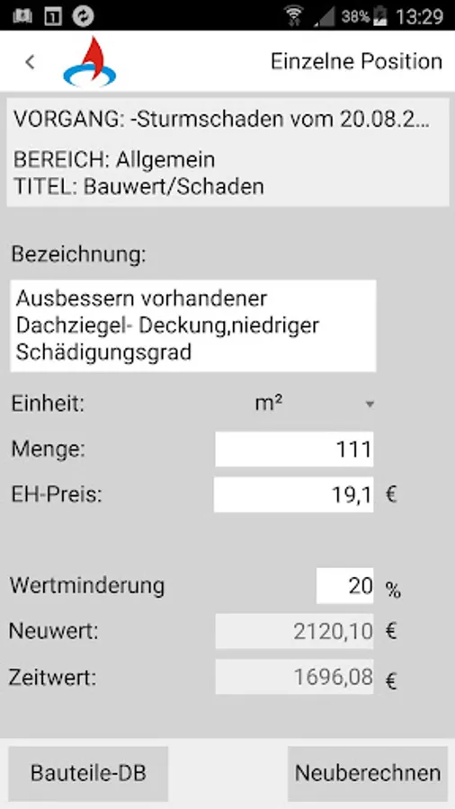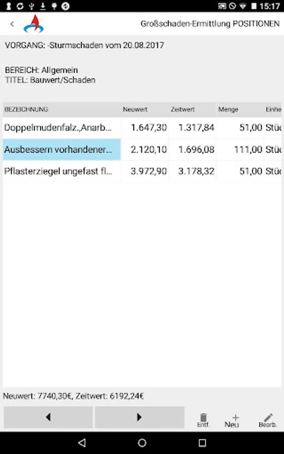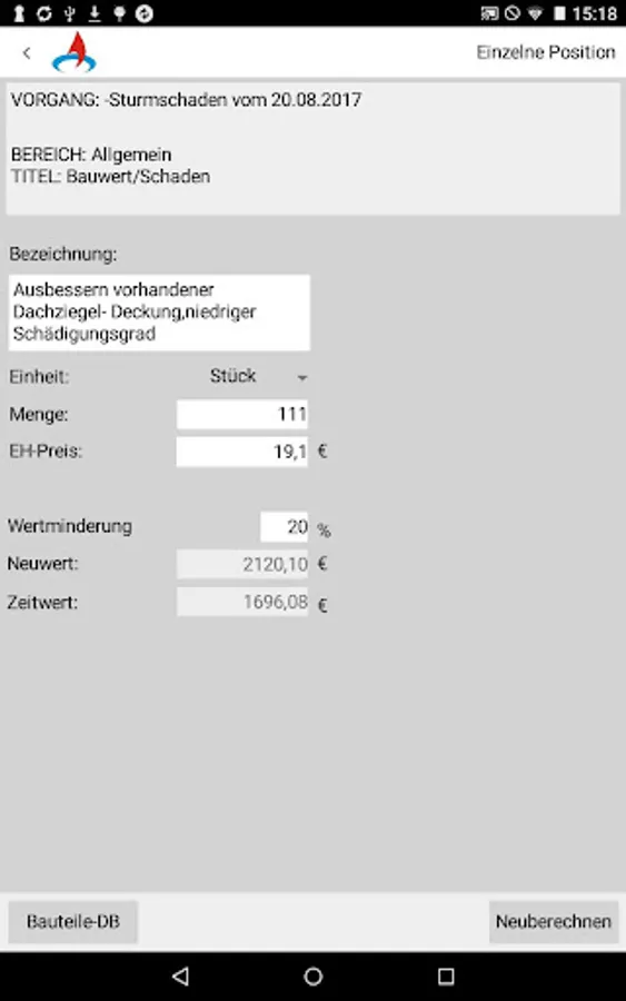 The damage assessment is also possible in a similar form as in the desktop program and you can immediately see new values and current values. You can also use an extensive component table with 9000 entries to record the individual items.