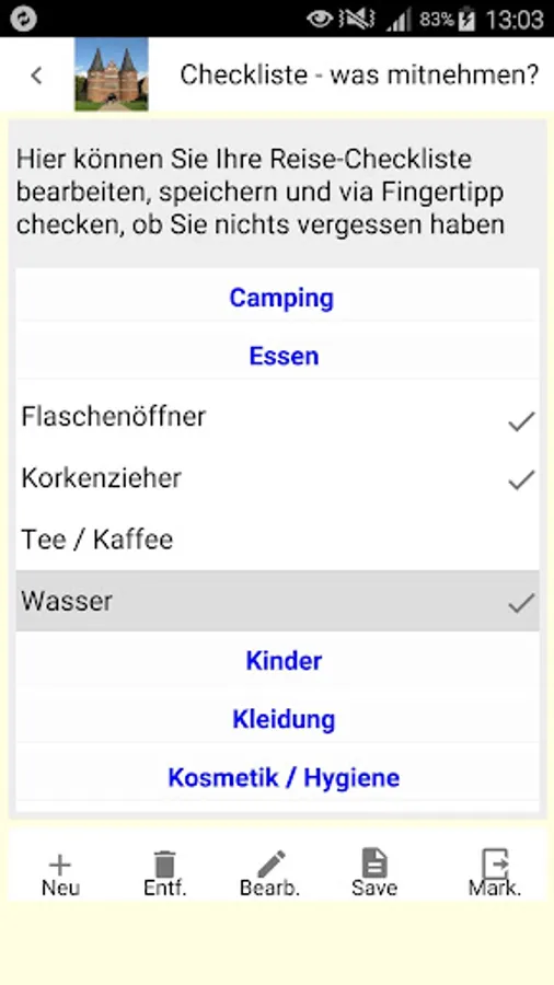 In addition to climate tables with average day, night and water temperatures as well as sunshine hours and rainy days, this app also contains travel checklists for your first-aid kit and your holiday luggage, which you can refine yourself and use again on your next vacation. You put a tick behind the things you have already packed with a tap of your finger. Before the next vacation, you can remove all hooks with one click. You can also keep a travel diary within the app and there is also a currency converter.