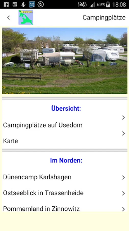- Overview of the campsites on Usedom and direct access to the campsites