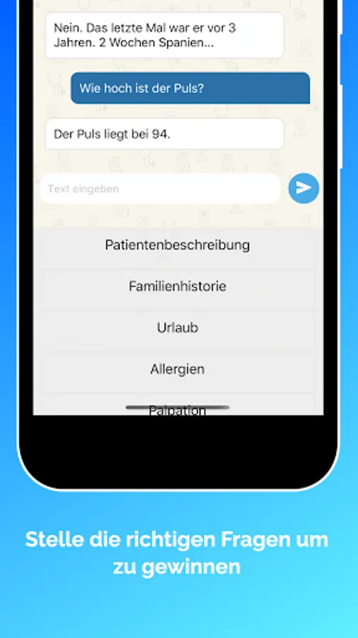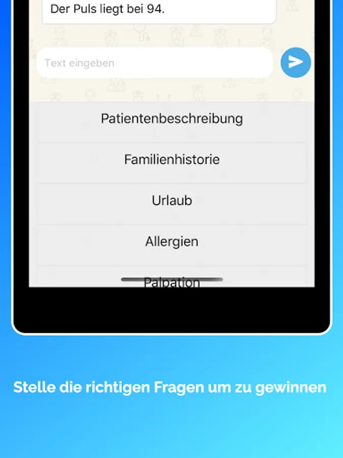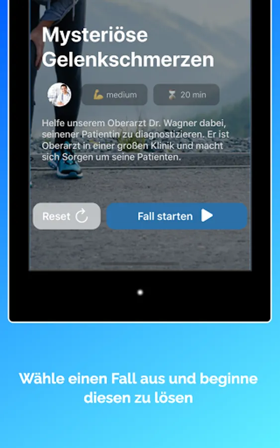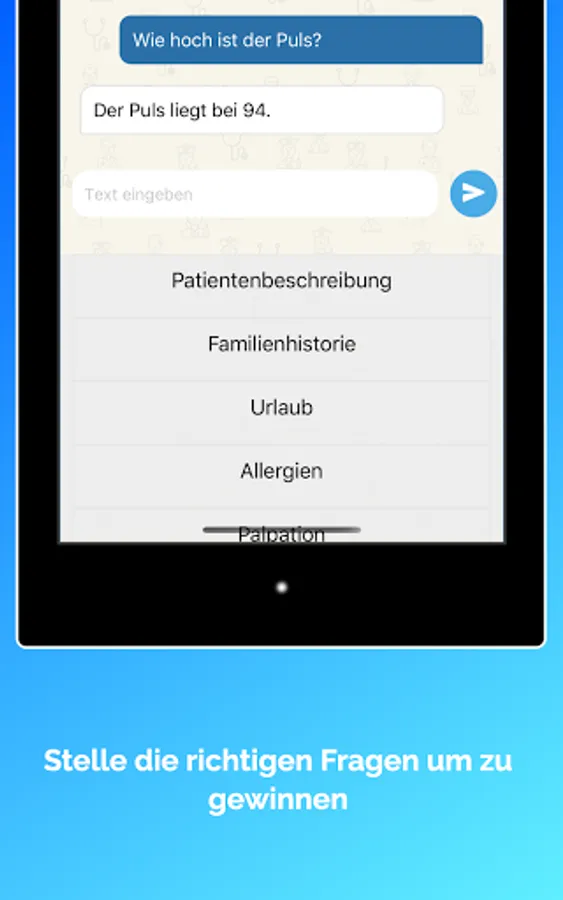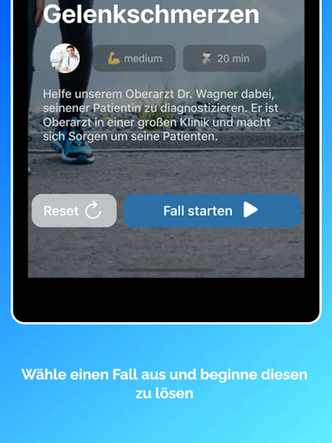 In DOCCASE, medical knowledge is queried concisely and across disciplines. DOCCASE is a game for doctors. DOCCASE requires correct medical questions in relation to the clinical picture and diagnostics. In DOCCASE there are realistic cases where colleagues describe symptoms of patients via chat and the colleague has to be provided with a diagnosis in a short time. DOCCASE is free of charge and is regularly updated with new cases.