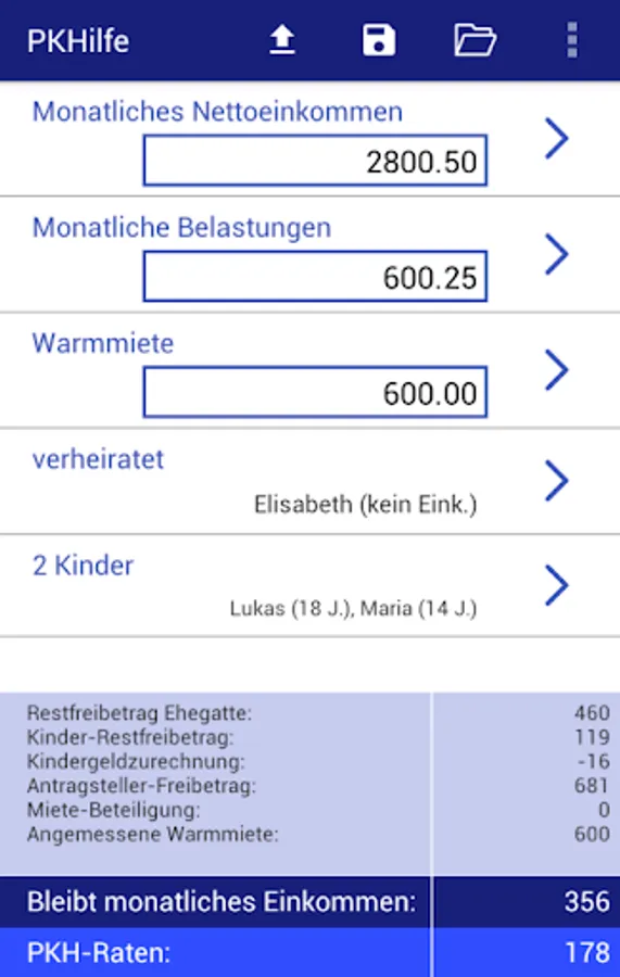 The calculation can be emailed to other users of the app and processed further by them. In this way, the client can easily transmit the values required for the PKH application to his lawyer.