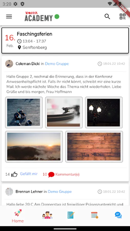 Create global or group/user specific announcements. Each role sees the relevant messages and can respond to them. You can also use the news feed for voting.