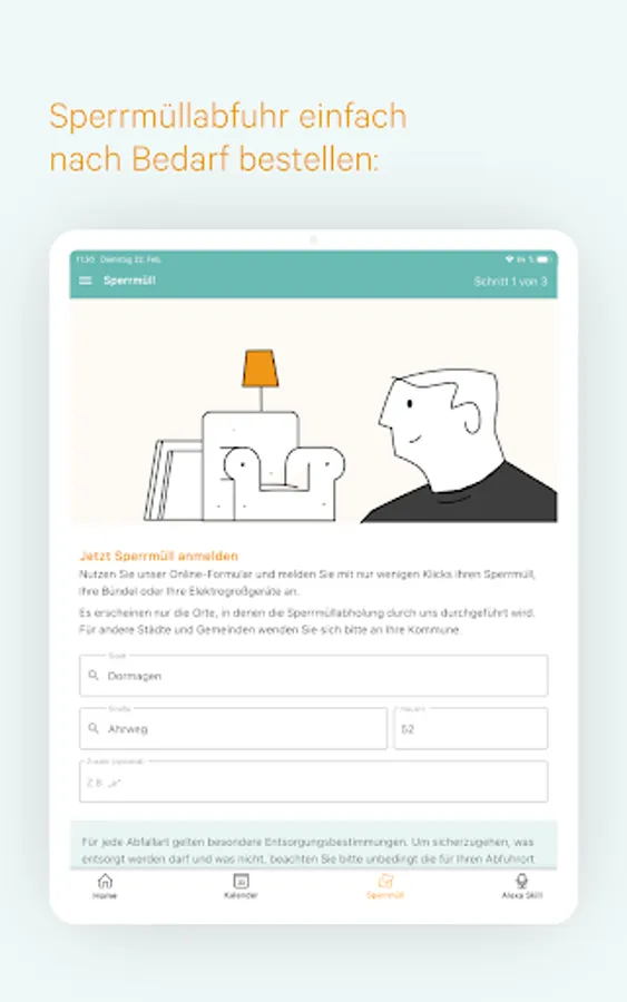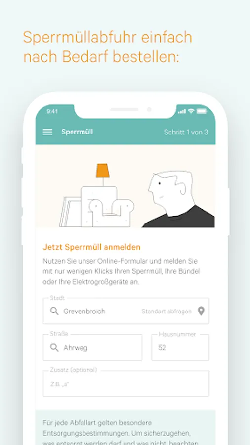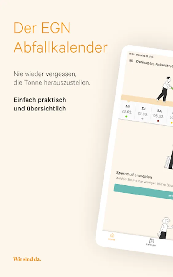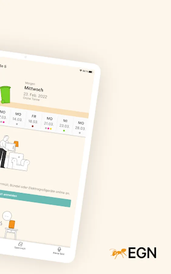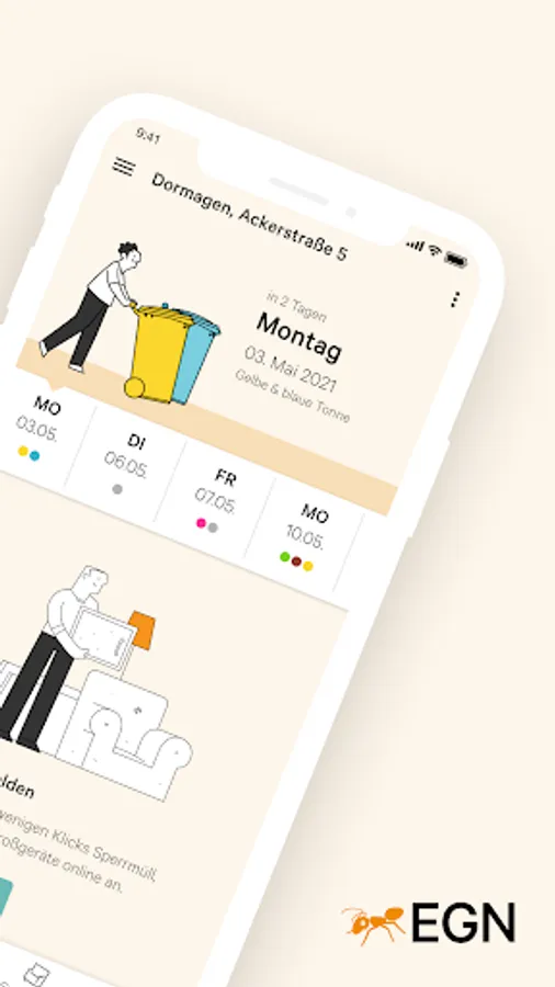 With the EGN Waste Calendar App, you will never miss a bin emptying appointment again. The waste calendar app is available for Dormagen, Grevenbroich, Nettetal, Schwalmtal, Brüggen and Grefrath. A push message reminds you of the rejection. Two reminder dates can be preselected. Reminder dates accurate to the minute are possible both for the days before emptying and for the day of emptying itself.