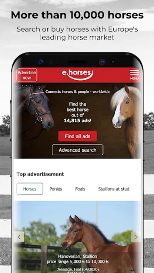 ehorses is Europe's leading horse market and offers you a selection of around 16,000 current horse advertisements. No matter what you are looking for - you will find it at ehorses. There are horses, ponies and foals of all breeds, disciplines and prices.