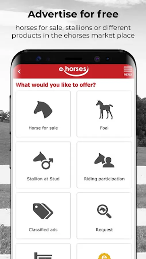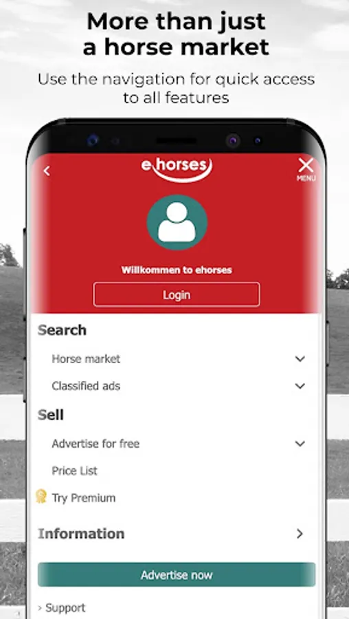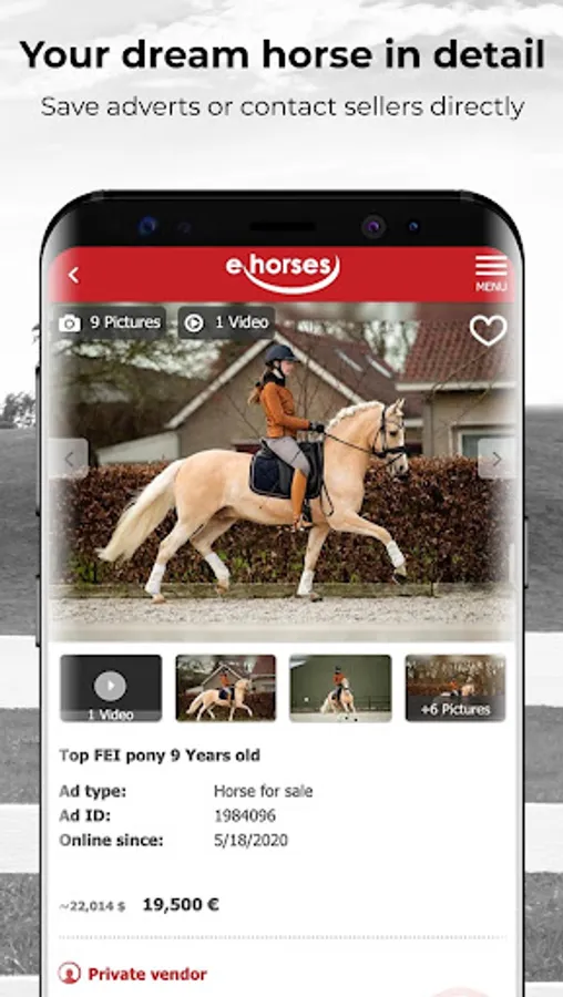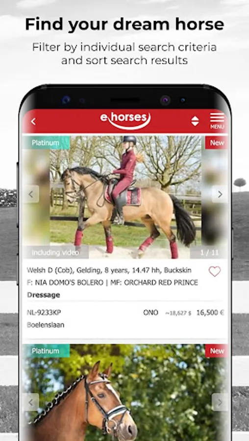 If you are looking for the right horse or you would like to sell your horse to the right person, then ehorses is exactly the right platform for you. In our horse app you will quickly and easily find a wide range of leisure and sport horses of all breeds. Whether it is a top trained dressage horse, a reliable show jumper or an excellent pony for leisure time - in our horse market you can choose from horses of all classes and disciplines. The personal watch list allows you to call up and compare your personal favourites horses at any time and from anywhere. Pictures, videos and important information such as pedigree, level of training, size and much more about the horses for sale help you to an impression of the horse.