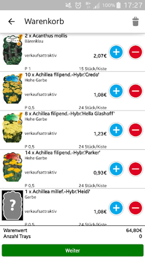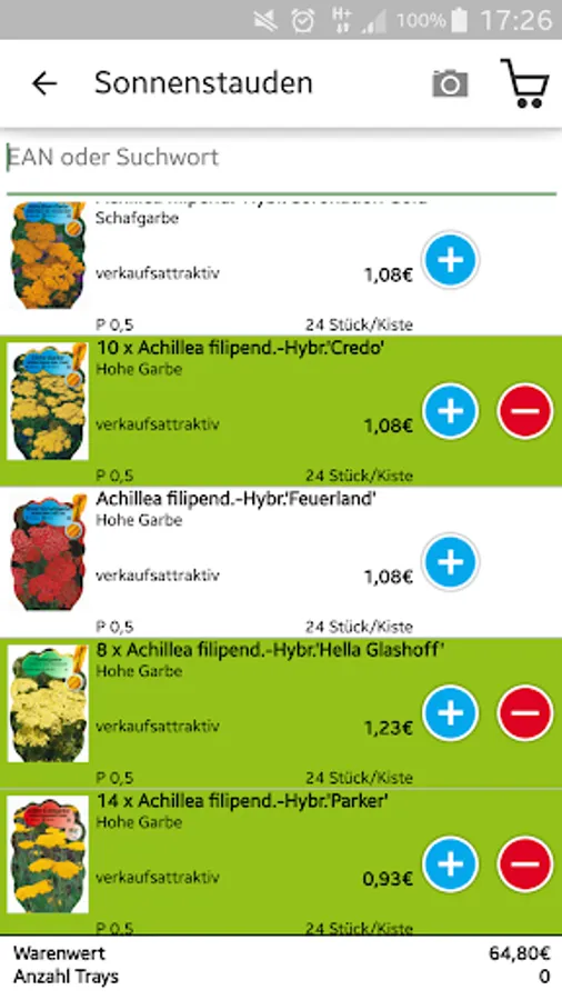 - For each variety a picture, the name of botanical and German, the Blühstatus, pot size, price and packaging unit is displayed.
