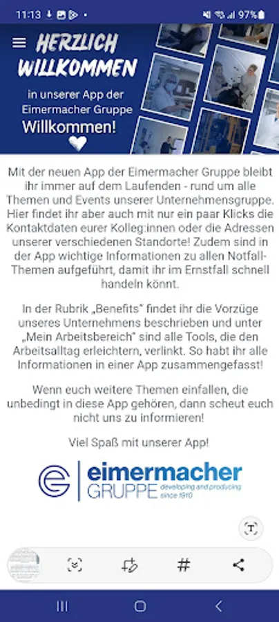 The Eimermacher Group's employee app is an information platform for internal communication throughout the company. The app can be accessed from any device, regardless of location. Internal news and information is shared via the app. With the app, we support employees in easily sharing messages throughout the company and staying informed.