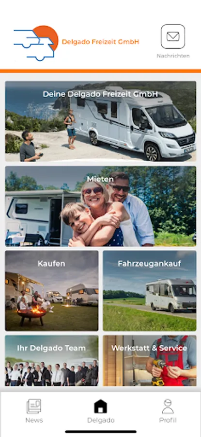 Digital business card, an overview of all caravans and mobile homes of Delgado Freizeit GmbH, the team of employees, videos, documents or websites - in your home view you can quickly and easily access the Delgado Freizeit GmbH information you want. You have everything you are interested in directly in the app on demand.