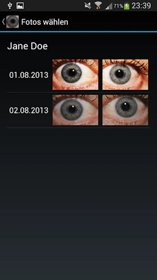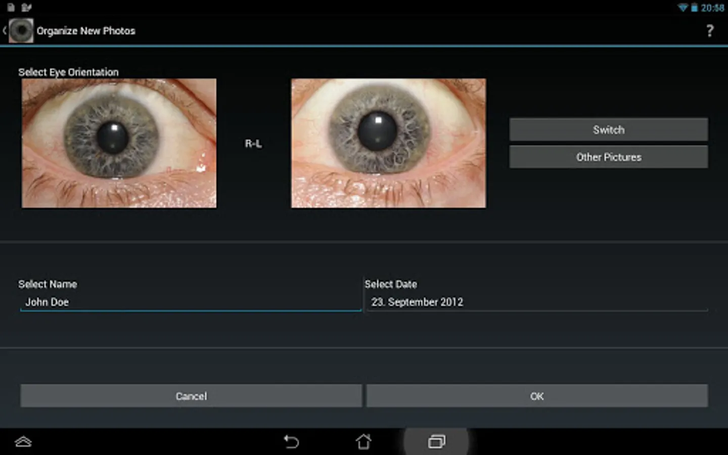 - the display of two eye photos in parallel (with full support of individual resizing), so that comparisons are possible (such as right-left comparison, earlier-later comparison, different person comparison, or comparison to an iris topography).