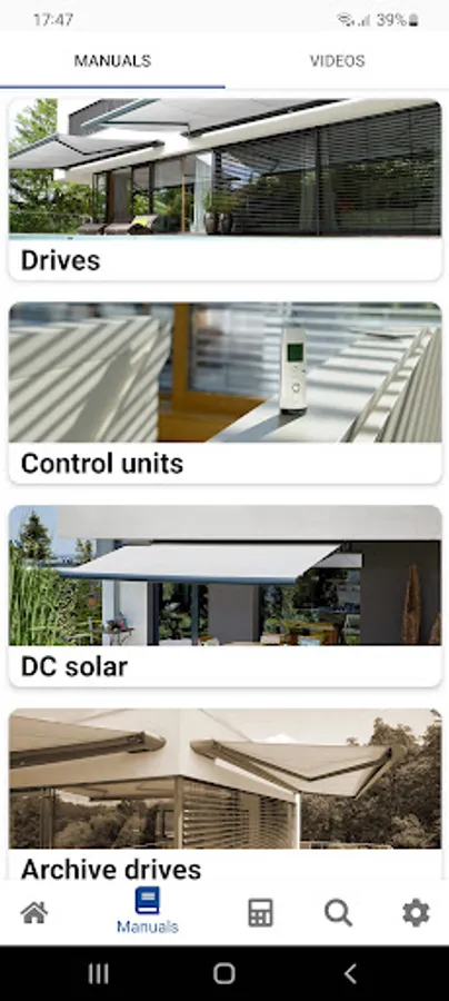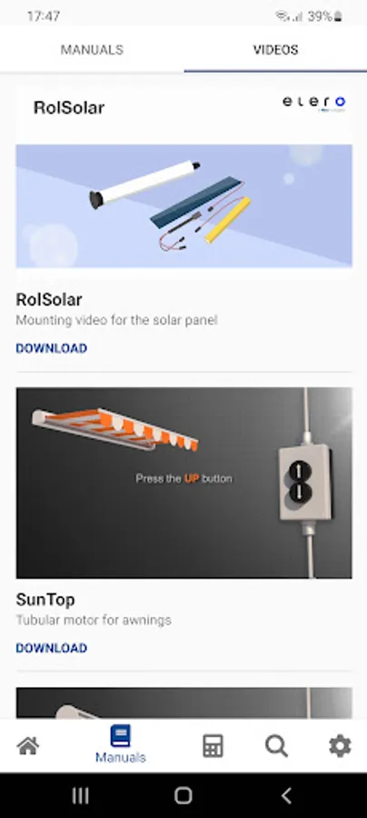 With the elero manuals app, you can conveniently and reliably have the right elero operating instructions with you on your smartphone or tablet - whether at home or on the run. Download the instruction PDFs once and you can access them anytime and anywhere, even without an internet connection, so you can be sure to have access to them when you need them! In addition, you have the possibility to download setting and programming videos of the elero products or watch them online. Furthermore, you can have the suitable drive calculated and we keep it up to date with news. And with the search function you can easily search for the desired instructions.