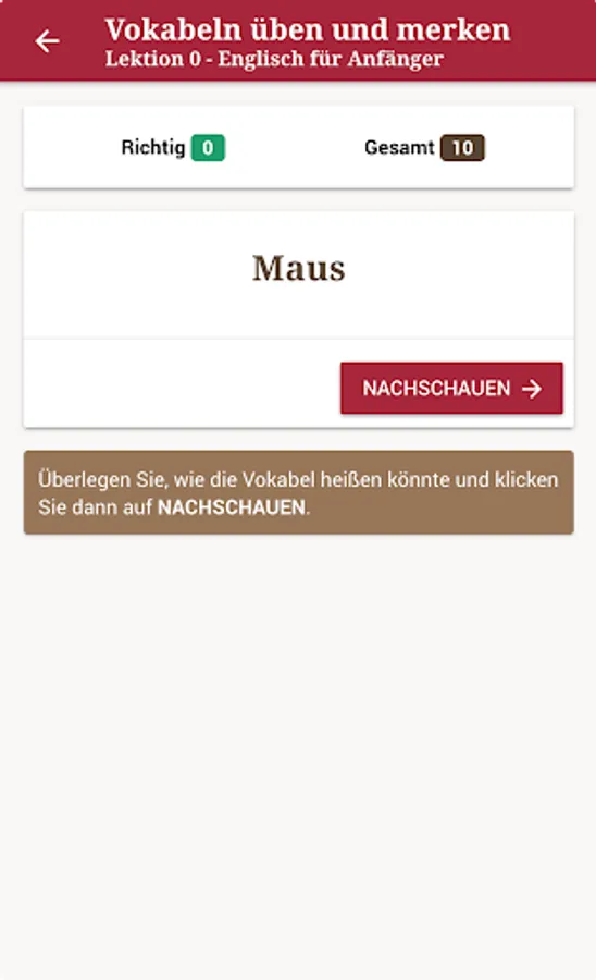 Step 1: You will see a word and exercise the learner can consider whether he already knows the translation. Then he can look - the answer is not correct, the word comes again later. At this stage the translation direction can be reversed. (German-language or foreign language-German).