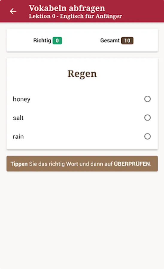 Step 2: The German word is displayed and the learning can choose from three proposals the right word.
