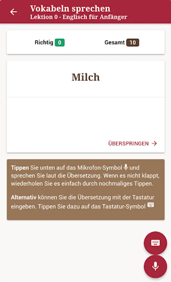 Step 3: The German word appears and the learner can speak the translation for it. the spoken word and the learner appears on the display to check whether the answer is correct.