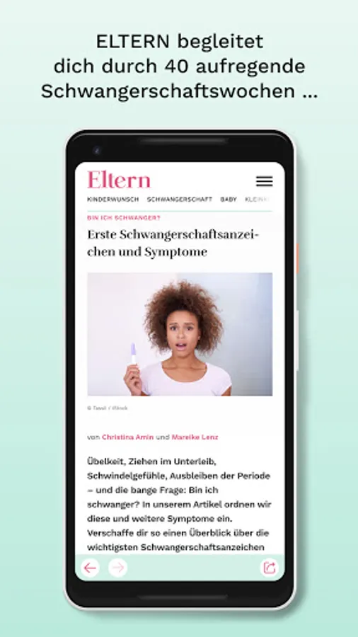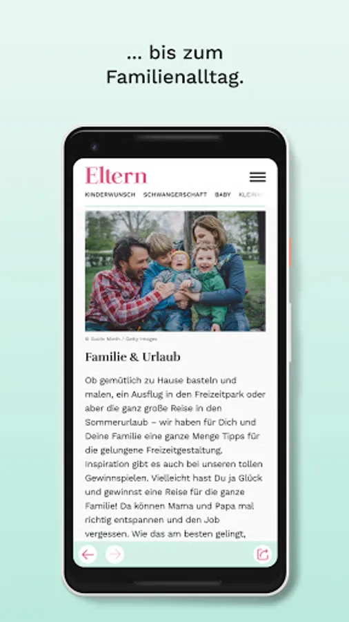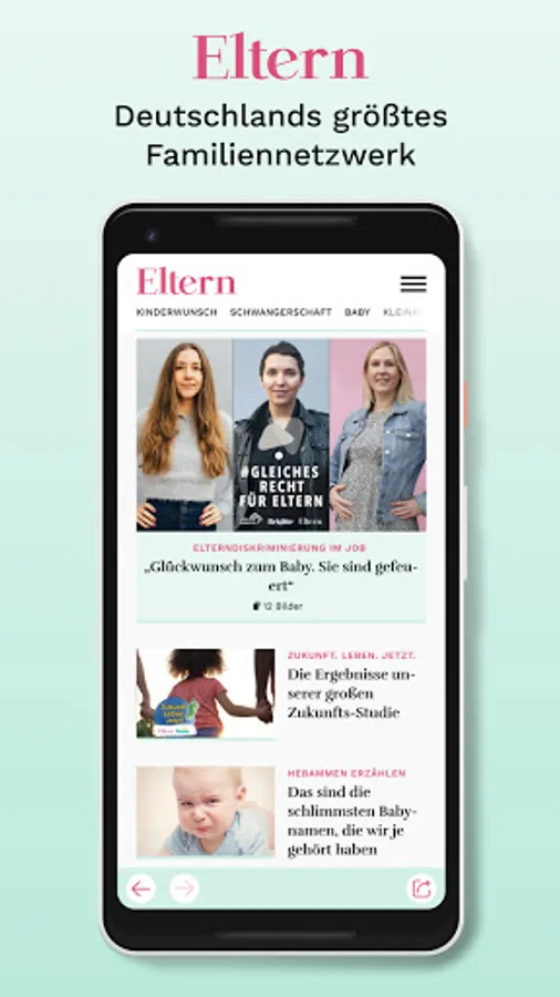 The Eltern.de app accompanies you from the first thoughts about a baby, over nine months of pregnancy and with all important questions about babies, children and families. In addition, the Eltern.de app offers you a lot of fun while mobile surfing with great photo series and exciting quiz questions.