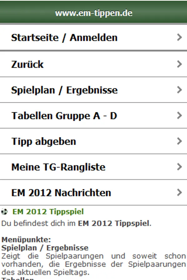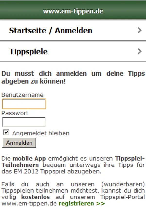The app allows participants of the betting game portal www.em-tippen.de to submit their bets in the various European Football Championship and World Cup betting games while on the go.