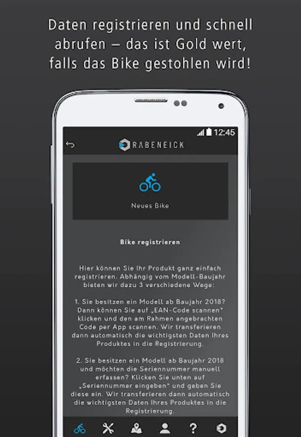 The app for the wheels of Rabeneick combines many advantages: Register via the app your bike at Rabeneick. If your bike has been stolen, you can quickly retrieve your personal data and the serial number of the bike in a PDF report for the police.
