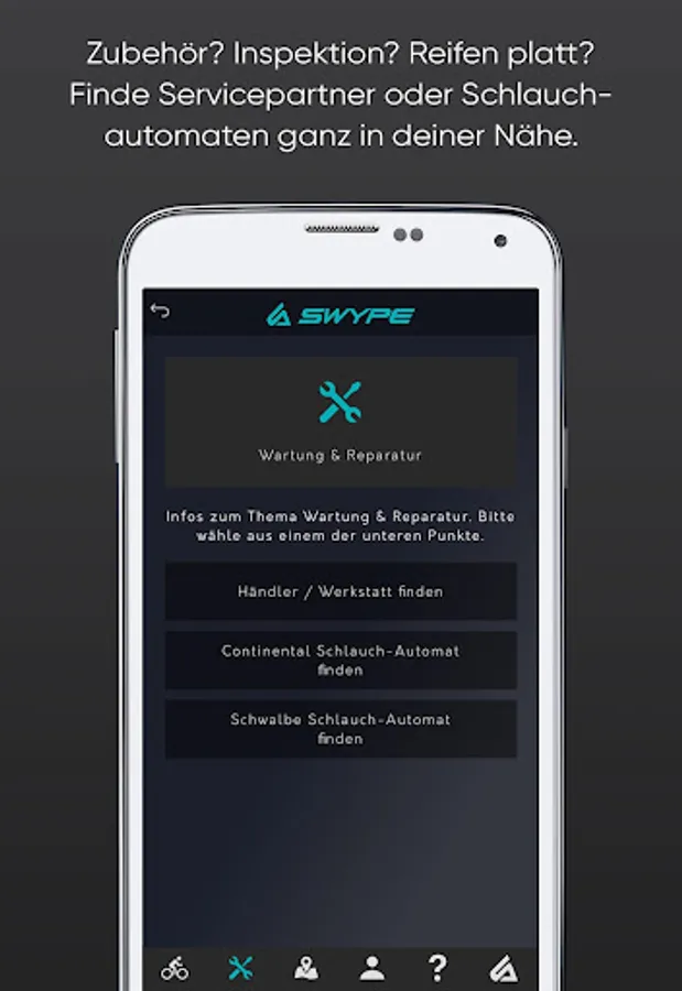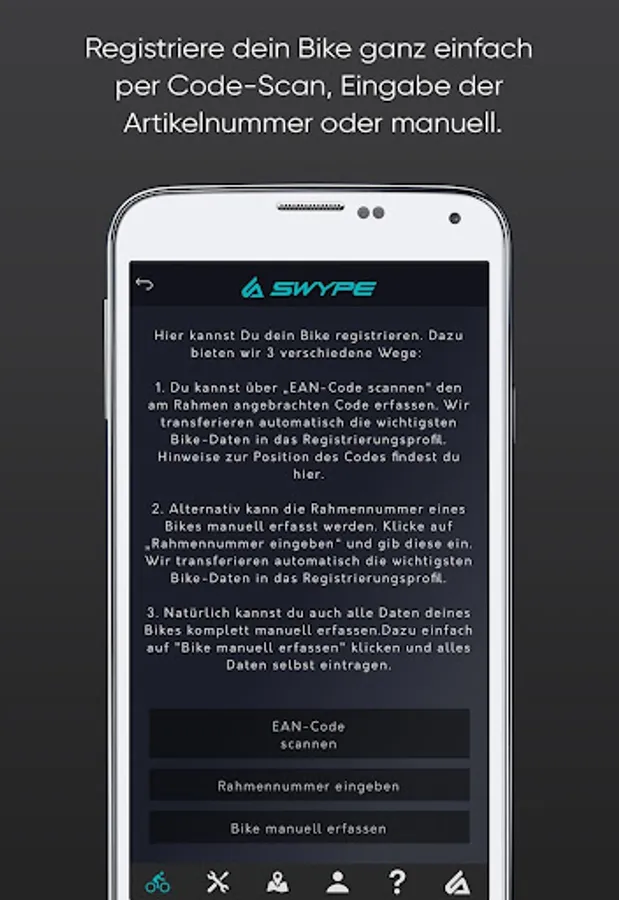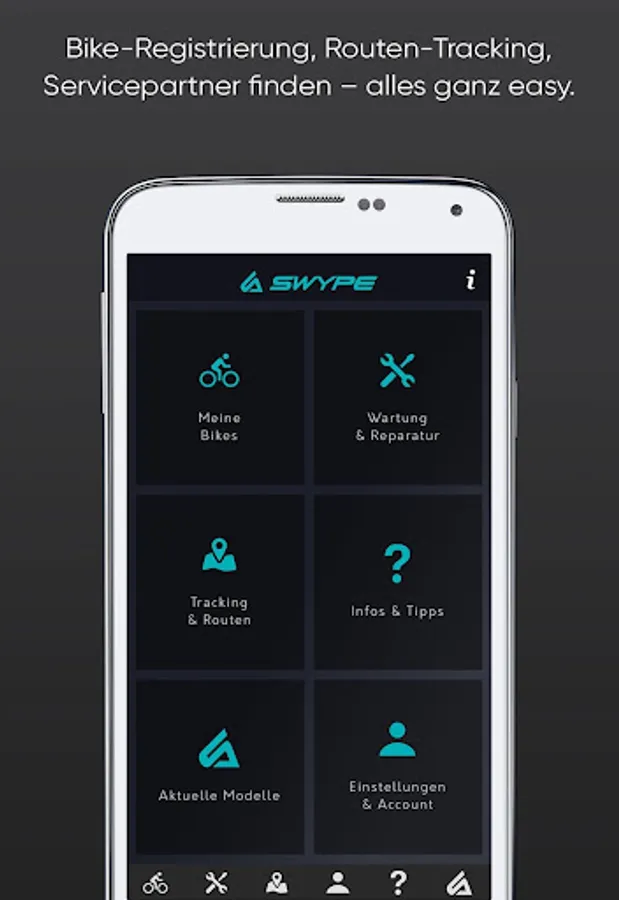 Download the SWYPE My Bike app now - the all-round app for your bike: register your bike with a code scan, track, save and share your most interesting routes or easily find a dealer, service partner or automatic tube machine near you.