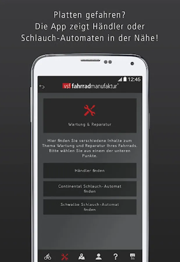 If a repair is required and you are not near the workshop of your choice, find the My Bike app quickly a dealer within. And best of all: Per push message you regularly get new offers of vsf bicycle manufactory delivered. To take advantage of exclusive benefits!
