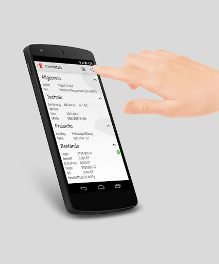 Our Mobile ERP Industry 4.0 Today – Business and Sales Organization App concept in short: it is a modular, IBM AS/400 centered SQL view towards any DB2 database report. No question, with supporting firewalls in the background. Its like quizzing the AS/400 midsize IBM Bladecenter. Only Q&A with predefined reports, no code execution. Concerning security: ALL data and login parameters, as well as user profiles are stored REMOTE not on your device. So if your device gets lost, its tragic but no security problem for vital company data. We operate on the frontend framework level, where as the database engine is in the certified secure backend. We name it our ERP Certified EAM App. Now, lets take the INTERNAL scenario: every person on the shopfloor can use tablet device to