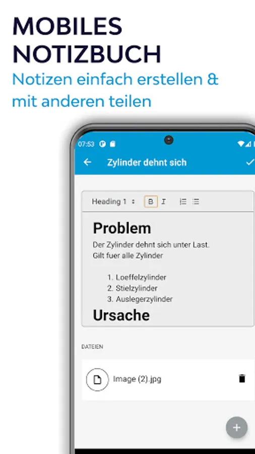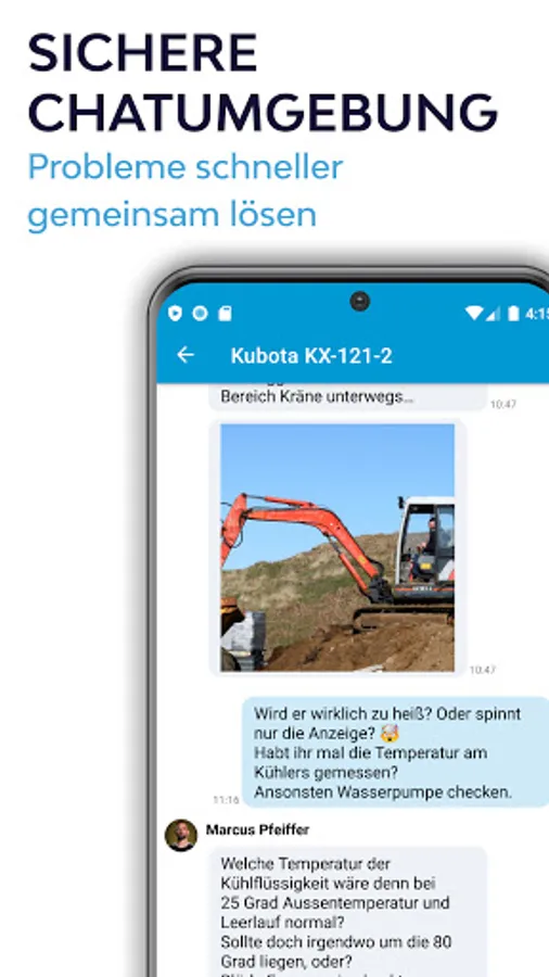 Are you stuck with a specific problem on a machine? Ask your questions in the group or direct them to experienced colleagues. With the help of our chat function, exchange information easily. In addition to specifying the machine type, customer data, etc., the integrated image processing, share videos and documents and the feedback function help avoid misunderstandings and find the right solution more quickly. The result: stress reduction, especially when prior unknown problems occur on site with the customer.
