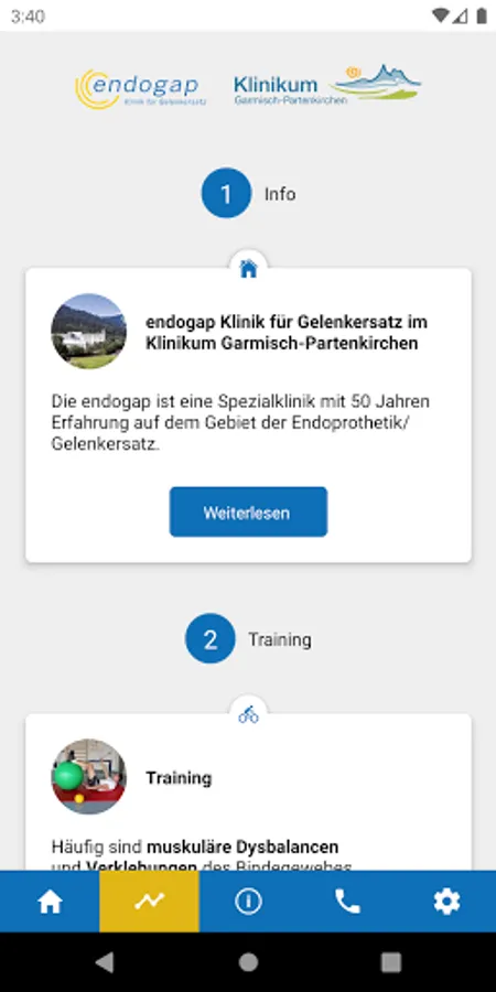 endogApp provides you with all the important information about your treatment in the endogap clinic for joint replacement at the Garmisch-Partenkirchen clinic. After you have downloaded the app, select your treatment and your treatment date. Your individual timeline will be created.