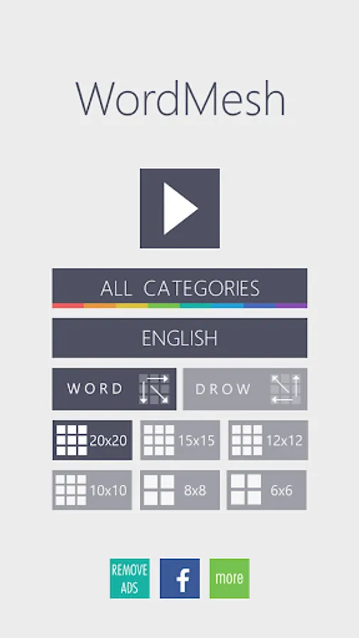 - Word Mesh sizes: 15x15 12x12 10x10 8x8 6x6 letters playfield