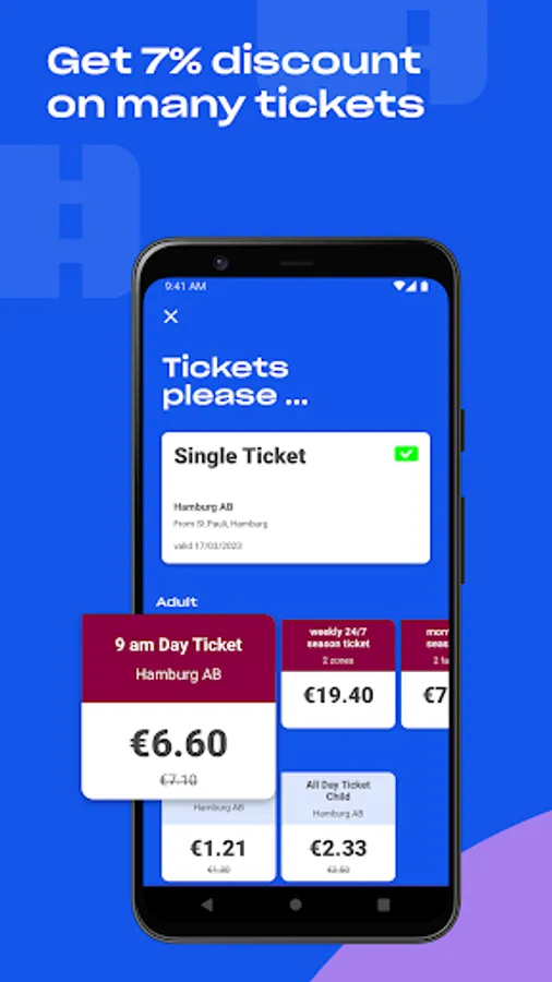 Pay for your public transport tickets online via PayPal, SEPA direct debit or credit card and save 7% compared to buying them at a ticket machine or on the bus. Weekly and monthly tickets and the Hamburg CARD are excluded. The displayed price of the ticket already includes the discount.